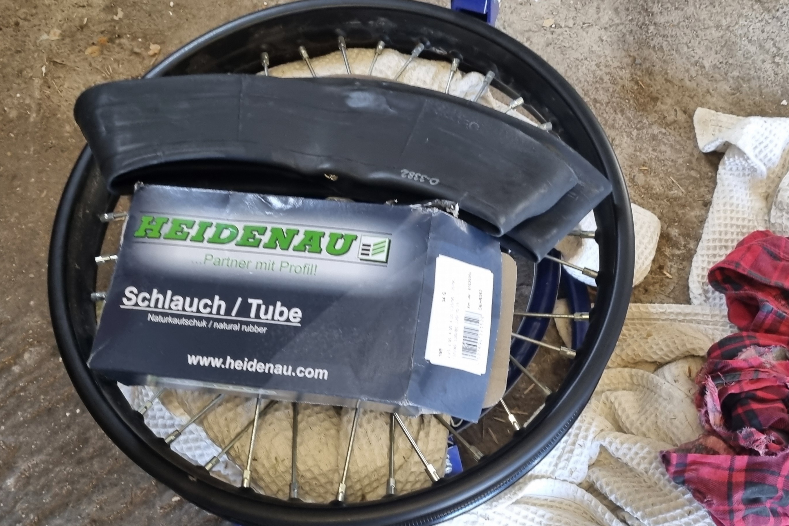 Duro HF308 TT 4PR 3.50x19 front. 400x18 rear. Hidenau heavy duty tubes were used as well. Way thicker than the Caet ones fitted from the factory.